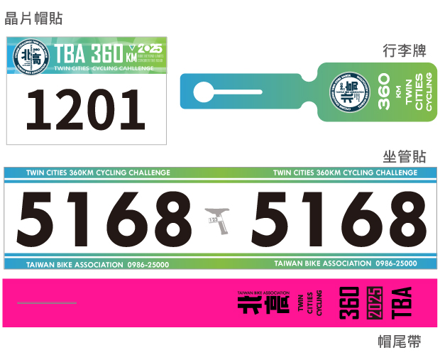 ■帽貼晶片: 帽貼已含晶片,請勿對折,活動時請將帽貼貼於安全帽正前方。 ■坐管貼 : 請依圖示對貼於坐管。 ■行李牌: 如有個人物品託運需求,請繫於個人背袋,出發前交付於工作人員,託運至終點。 ■帽尾帶: 請繫於安全帽後方,以供辨識。 ■有加購接駁車者物資內沒有乘車券,請於表定發車時間前至集合地點報到,核對無誤後由工作人員安排搭車。